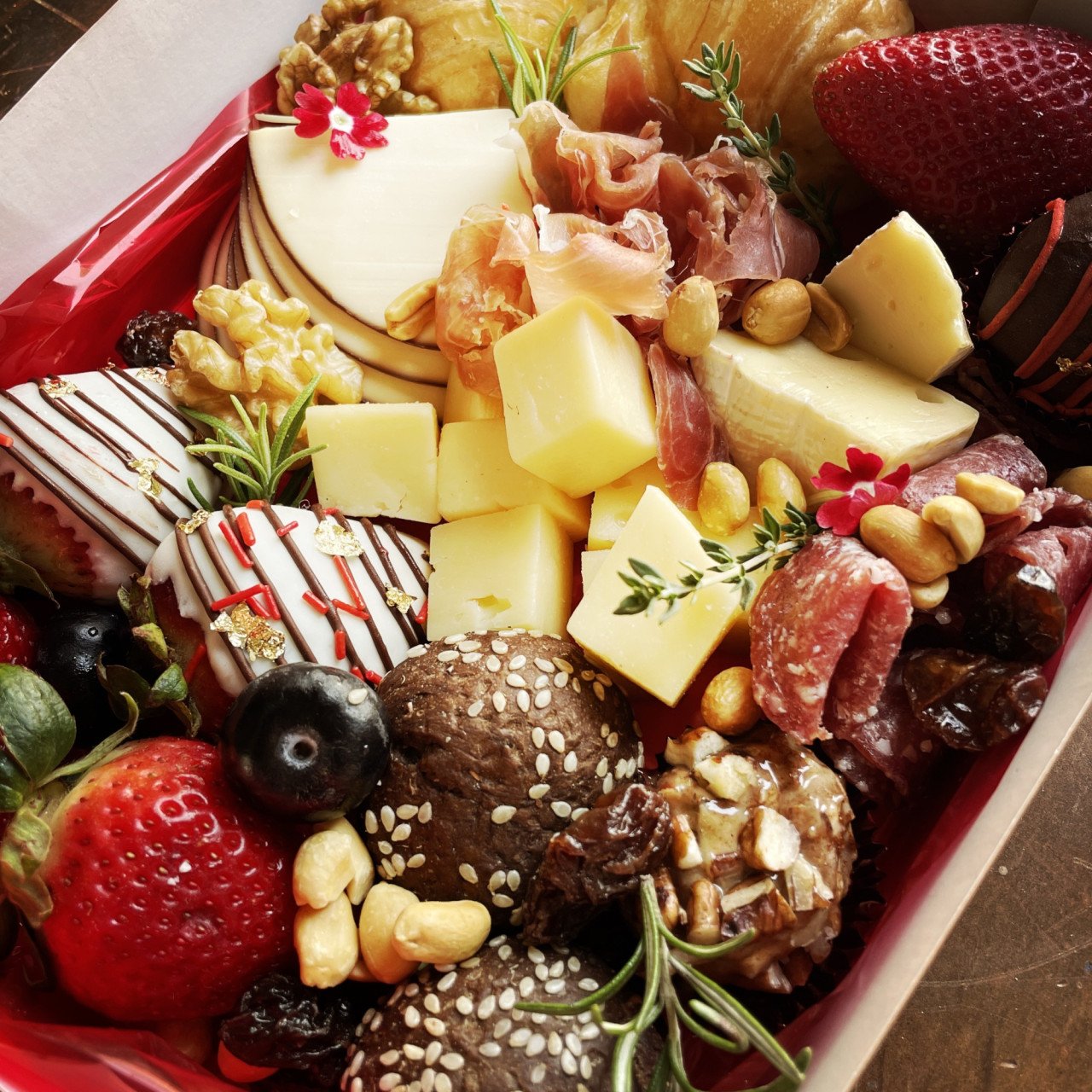 Incluye 1 Bombón relleno de Pranilé 1 Bolita de Pecana y Canela 16gr Jamón Serrano 16gr Salame Húngaro 60gr Queso Gouda 40gr Queso Ahumado 40gr Queso Brie 2 mini croissant 2 pancitos negritos Fresas bañadas en chocolate blanco Frutos Secos *Presentación en caja